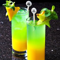Na coqueteleira bata com gelo a cachaça e o licor, coe devagar para que os ingredientes não se misturem.